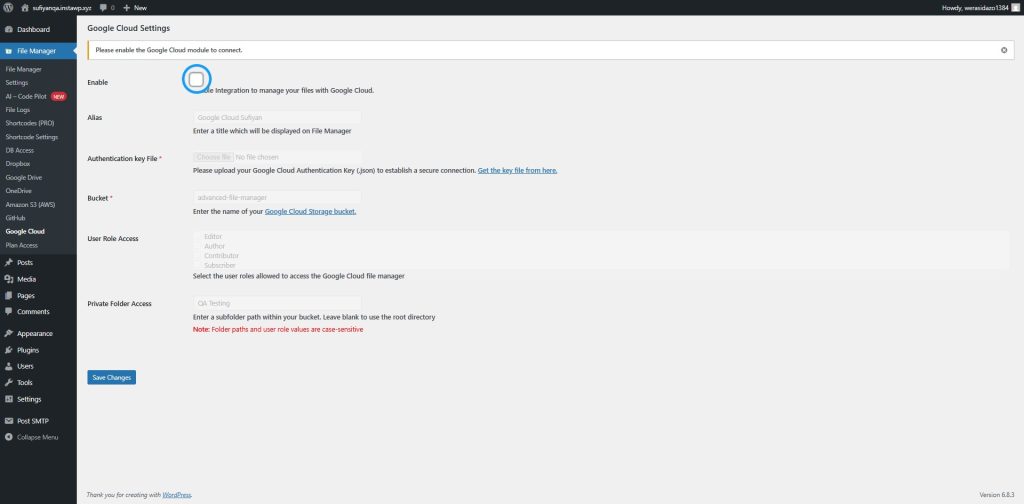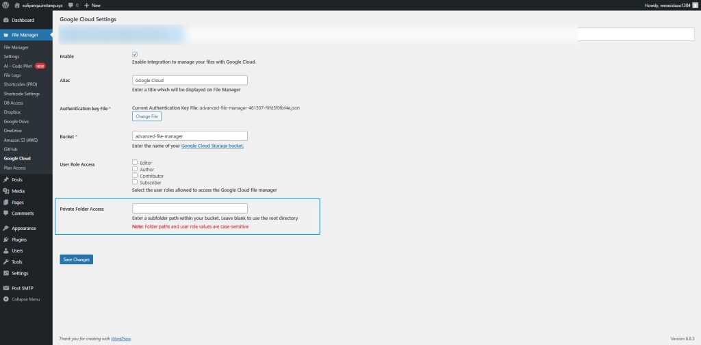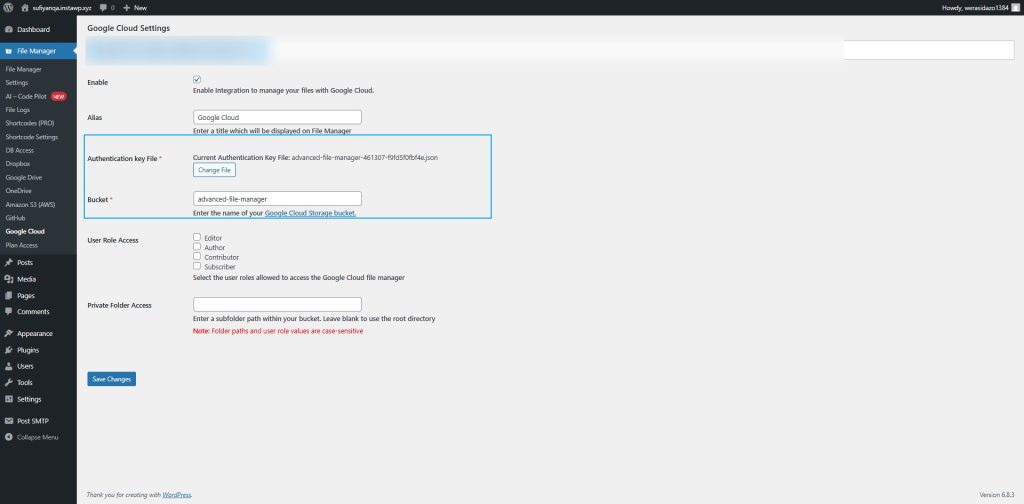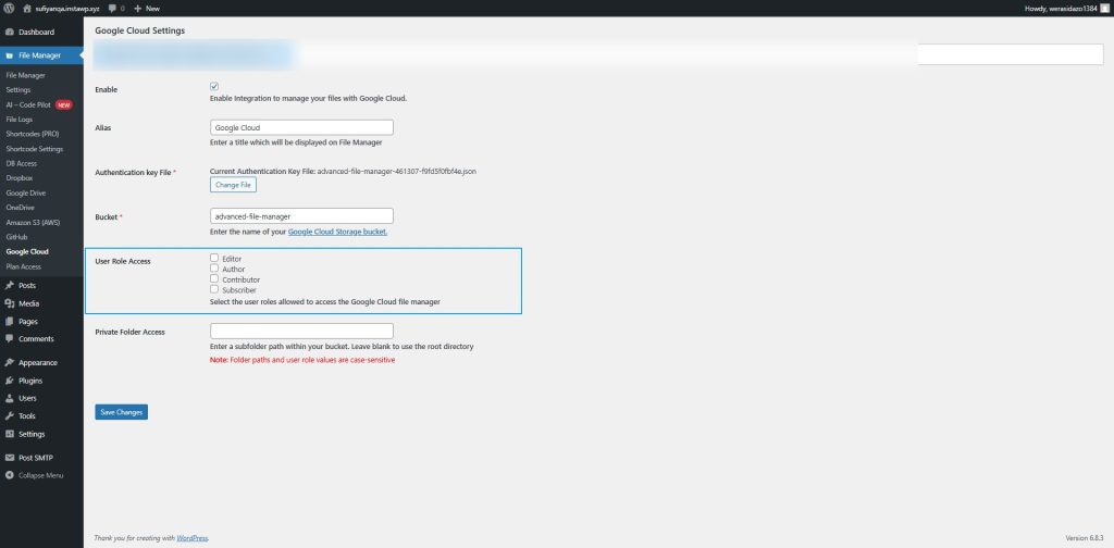 Only the selected roles (e.g., Editor, Author, Contributor, Subscriber) will be able to view and manage Google Cloud files inside File Manager.