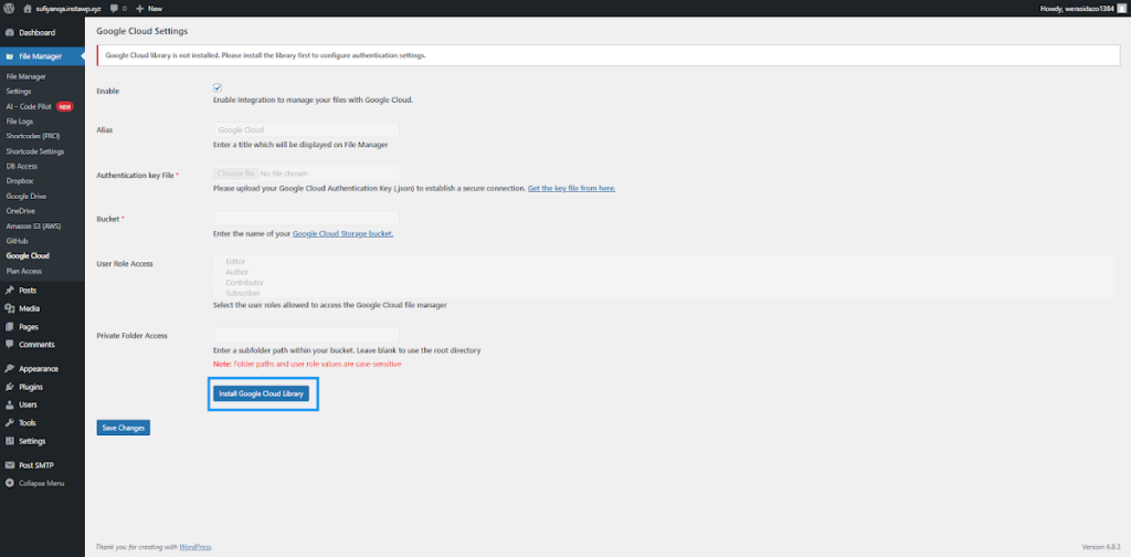 Note: Once you enable this option and click the Save Changes button, an “Install Google Cloud Library” button will appear. Click this button to install the required library for Google Cloud integration. The integration will not work until the library is successfully installed.