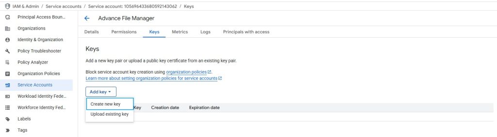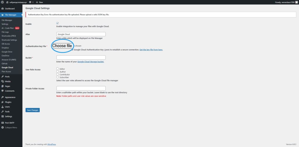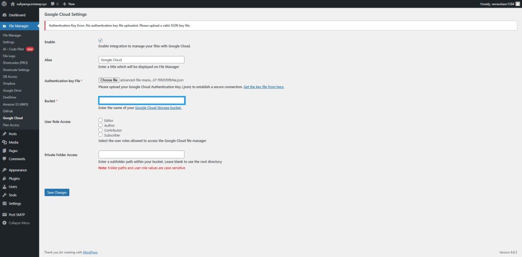 - Upload this JSON file to the Authentication Key File field in the Advanced File Manager.
